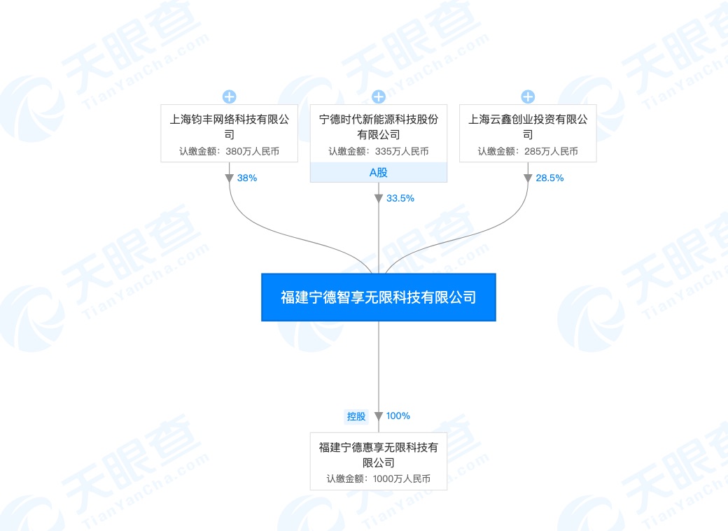 据天眼查数据显示,7月1日,福建宁德智享无限科技有限公司发生工商变更,新增股东蚂蚁金服旗下上海云鑫创业投资有限公司,持股28.5%;宁德时代新能源科技股份有限公