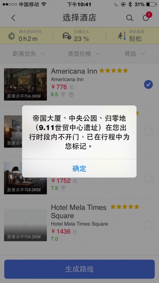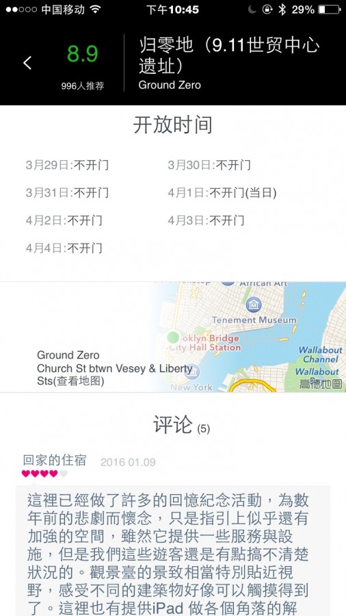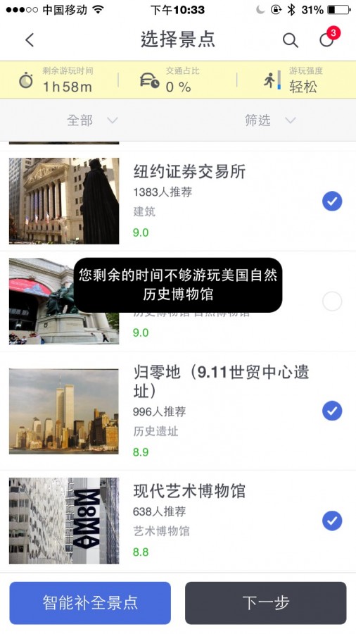 这些像大众点评一样有星级推荐的景点包括到此一游的必去项,也有对于小确幸的我来说很不错的地点推荐。最后我选了纽约大名鼎鼎的艺博馆、华尔街和归零地。我也可以点进每一个景点查看开门的时间和游客们的评论。当然如果景点开放时间和你的行程发生冲突时,最后生成的旅行清单也会做出报错的提示,这个稍后再说。