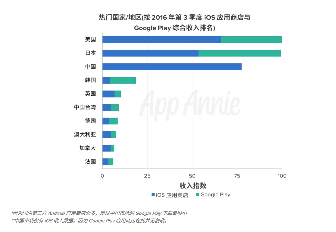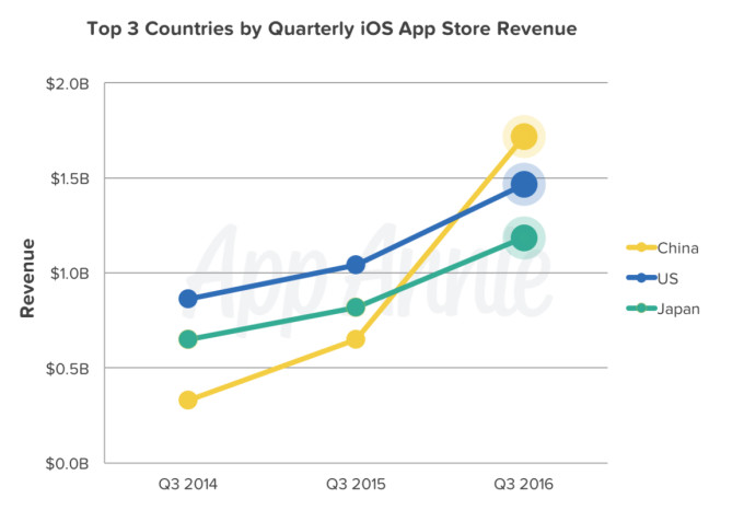 调研公司App Annie近日发布报告称,今年第三季度,中国首次超越美国成为全球最大的iOS App Store营收市场。自2010年以来,美国一直是全球最大的iOS市场。在刚刚过去的第三季度,美国的该霸主地位终于被中国超越。App Annie今年第一季度就曾预计,基于当前的发展速度,中国将在年底前超越美国。