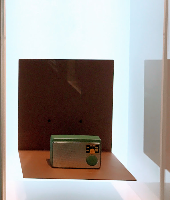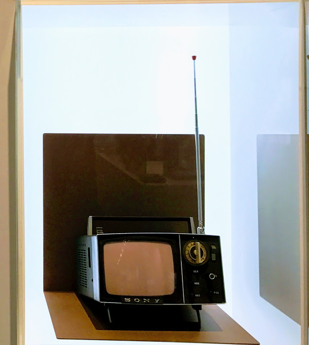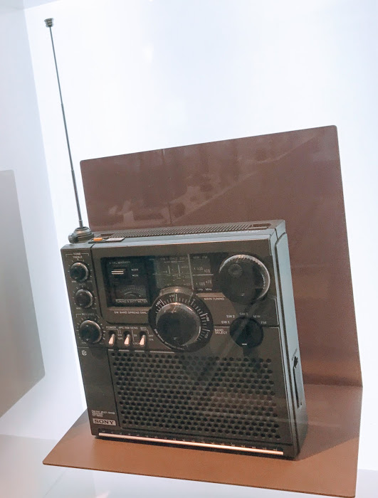 一进门,黑底墙上罗列着索尼重大的历史事件和节点,从左到右分别是1960年SONY在美国的办公室 /第一台收音机TR55 问世/SONY之前的公司名牌/创始人井深大与诺奖得主合影/第一台磁带录音机C-301生产现场/1968年SONY的第一款大型彩色屏幕/迈克尔杰克逊参观SONY总部。而左上方那座停摆的时钟似乎意味着经典将永存于世间。