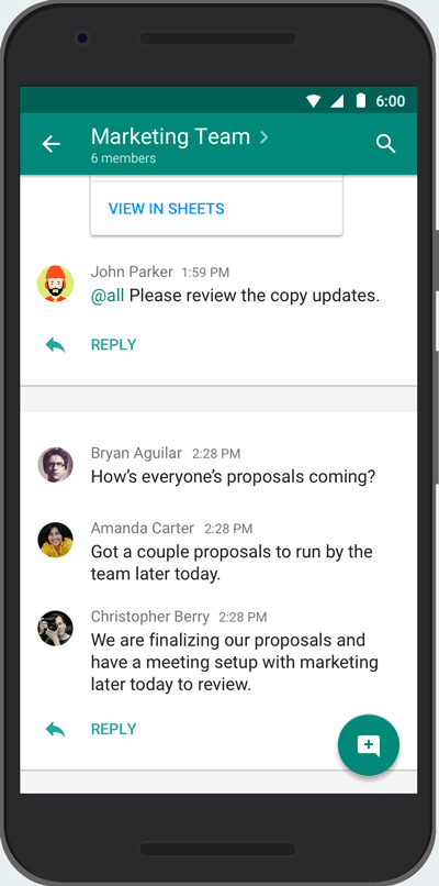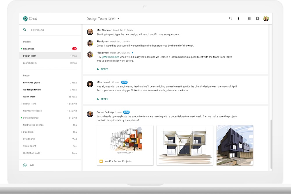 参会者通过 Hangouts Chat 创建虚拟会议室后,便可在其中分享文稿、交换工作建议等。Chat 还包含了一个聊天机器人 @meet,Meet Bot 可以自动分析参会者什么时候有空,整理出大家都空闲的时间,提供会议时间建议。