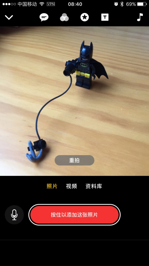 一段简短演示结束后就来到了应用的开始界面,可以选择拍摄照片、视频,或是从资料库有中选择你想要的素材。需要注意的是,Clips 的操作逻辑是将录制的片段(播放照片、视频)逐一排列在屏幕下方的时间轴处,录制完一段后,可进行编辑。