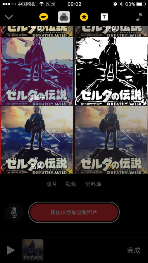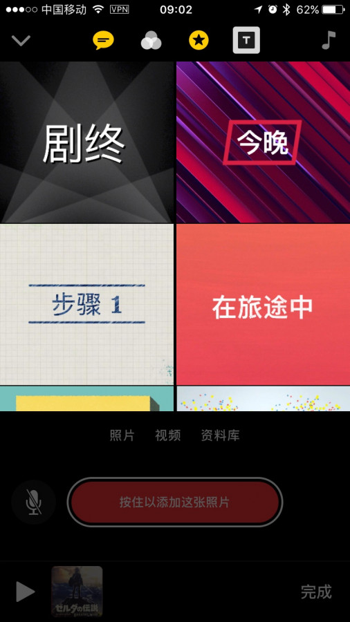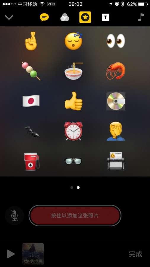编辑片段可选应用上方的 5 个功能,从左至右分别是添加即时字幕(在静音状态下,录制的同时对着麦克风说话,便能自动生成字幕)、滤镜、贴纸和 emoji、转场片段和背景音乐。其中背景音乐可以选择系统自带的,也可以是来自你的 Apple Music 曲库。
