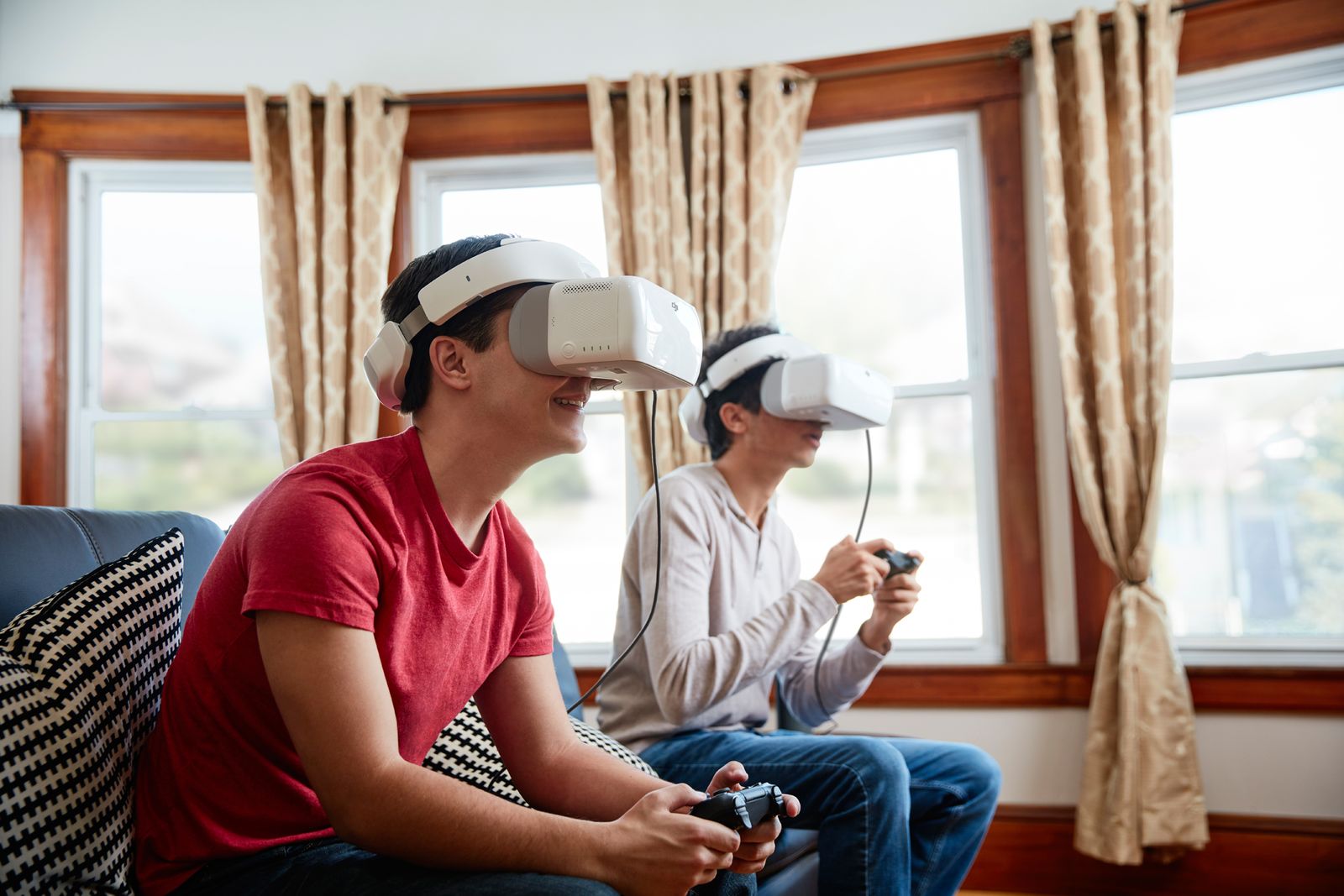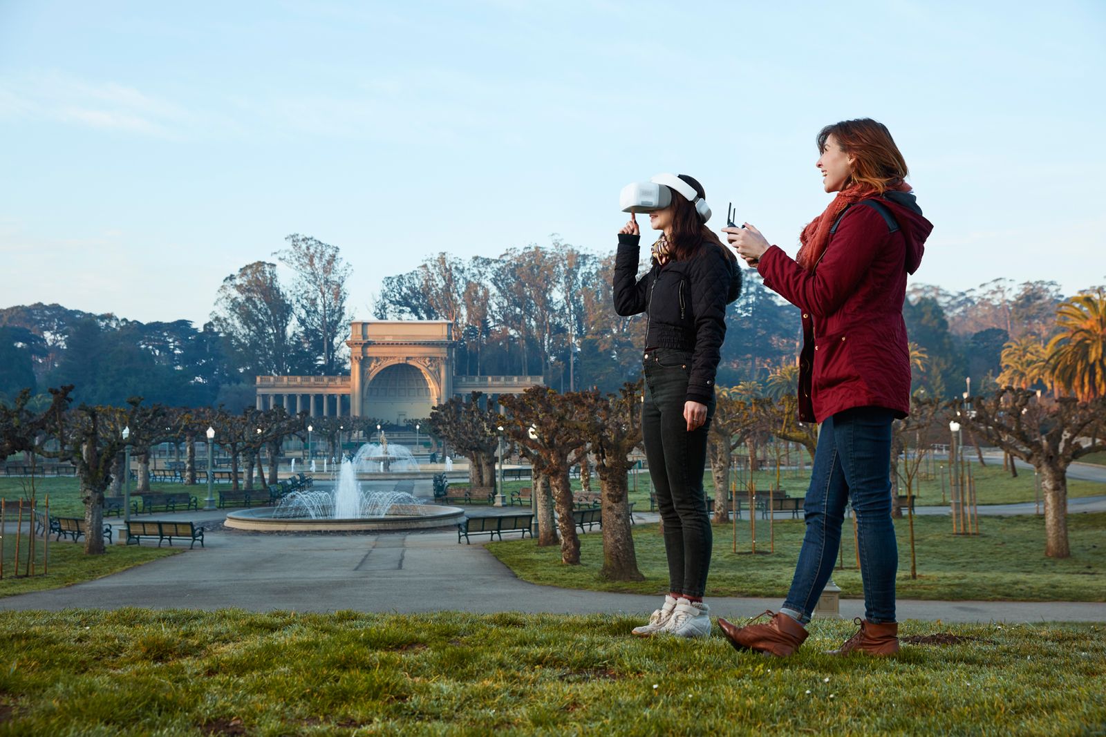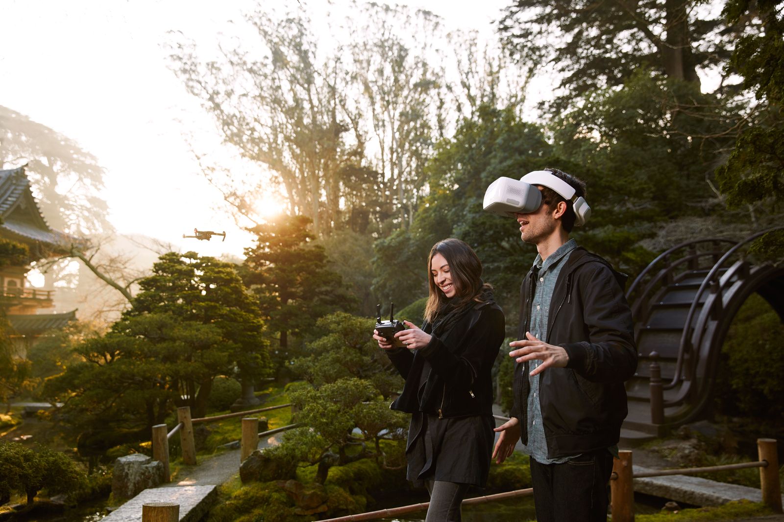 DJI Goggles 的一大亮点功能是可以通过左右上下移动头部操控飞行器或相机云台的转动,比如用头部控制飞行器在水平方向进行 360 度转动,即可轻松观察四周环境。而在智能飞行模式下,用户可以体验操控固定翼飞机的乐趣,比如转动头部就可以实现盘旋、滑翔的飞行动作,同时 DJI Goggles 也支持智能跟随、指点飞行、地形跟随、影像模式、三脚架模式和一键起飞/返航。