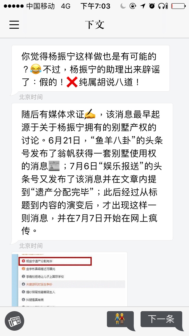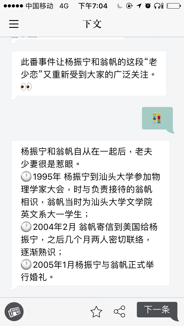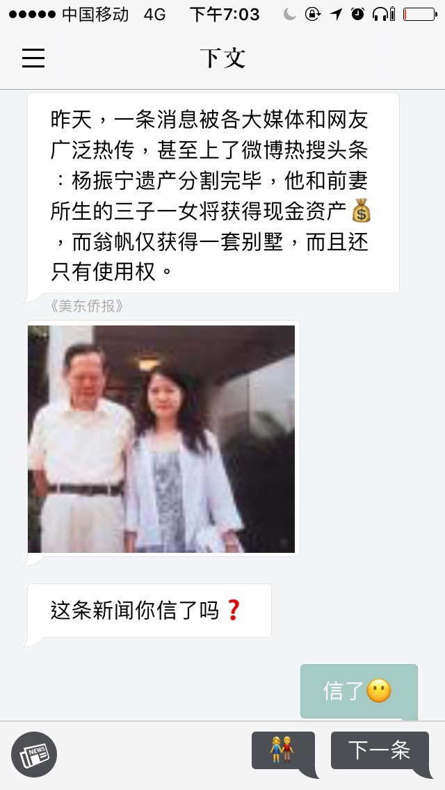第一次打开下文,用户会看到一个类似的聊天屏幕。 “欢迎来到下文的新闻世界”,还调皮让你猜猜他是真人还是AI。当然,调戏过后它会一本正经解释这个应用程序的工作原理——通过每一轮提示用户回答多项选择问题,增加了互动性。例如,你可以猜测这条“Mr. Yang和翁帆终于又离婚了”的消息是否出自谣传并在下文中看到已被证实的辟谣文章,当然还有更多你可能关心的相关八卦。另一些新闻功能则以“讨论”图标结束,用户可以按下该图标打开专门讨论该主题的聊天室。