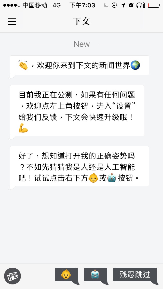 该应用程序取名为颇有深意的“下文”,它的主要特色是允许用户通过与模拟即时通讯会话中的机器人,与之发生交互来发现新闻。经过四个月的研发,它于6月28日在移动应用商店上发布了所谓公测版。