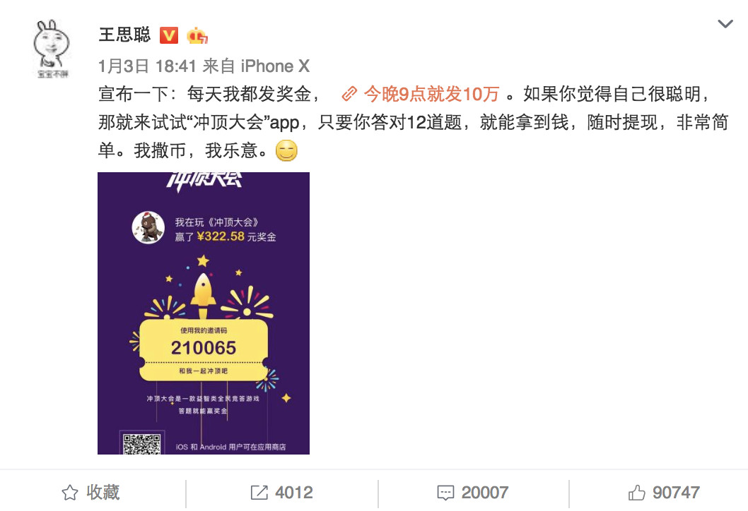 要一定从中说国内这些模仿者有哪些“拿来主义”之外的本地化特色,想必只有这波风口起来如此迅猛背后资本力量和娱乐明星的推动了,前有王思聪30岁生日之际应大众对“富二代”的人设预期,喊出了“我撒币、我乐意”的口号,于当晚21点在冲顶大会撒钱10万,实现28万人在线参与;后又在微信朋友圈发文开炮:王思聪撒币,张一鸣撒币,周鸿祎撒币,奉佑生撒币。外加上明星圈杨幂这样的好友来替之卖力吆喝,这点怕是老外和鼻祖之流想学学不到的东西了。