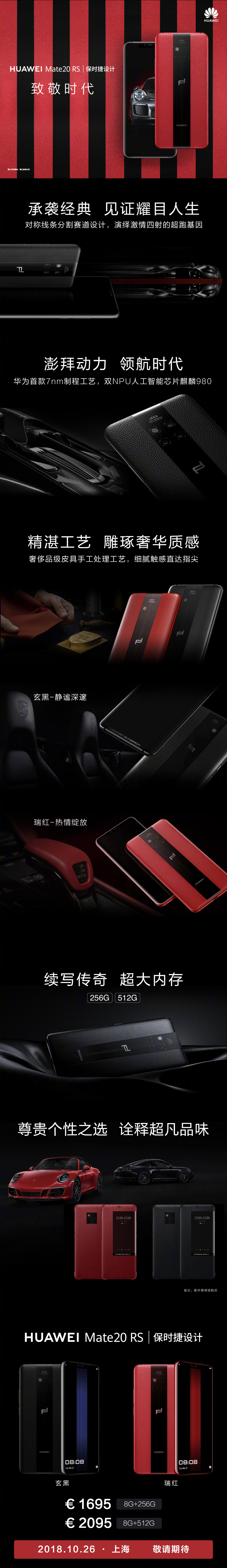 Mate 20 分为 4GB RAM + 128GB 存储容量、6 + 128 两个版本,售价分别是 799 欧元和 849 欧元,Mate 20 Pro 要价 1049 欧元(6 + 128),Mate 20 X 的售价是 899 欧元(6 + 128),Mate 20 RS 则是 1695 欧元(8 + 256)和 2095 欧元(8 + 512)。