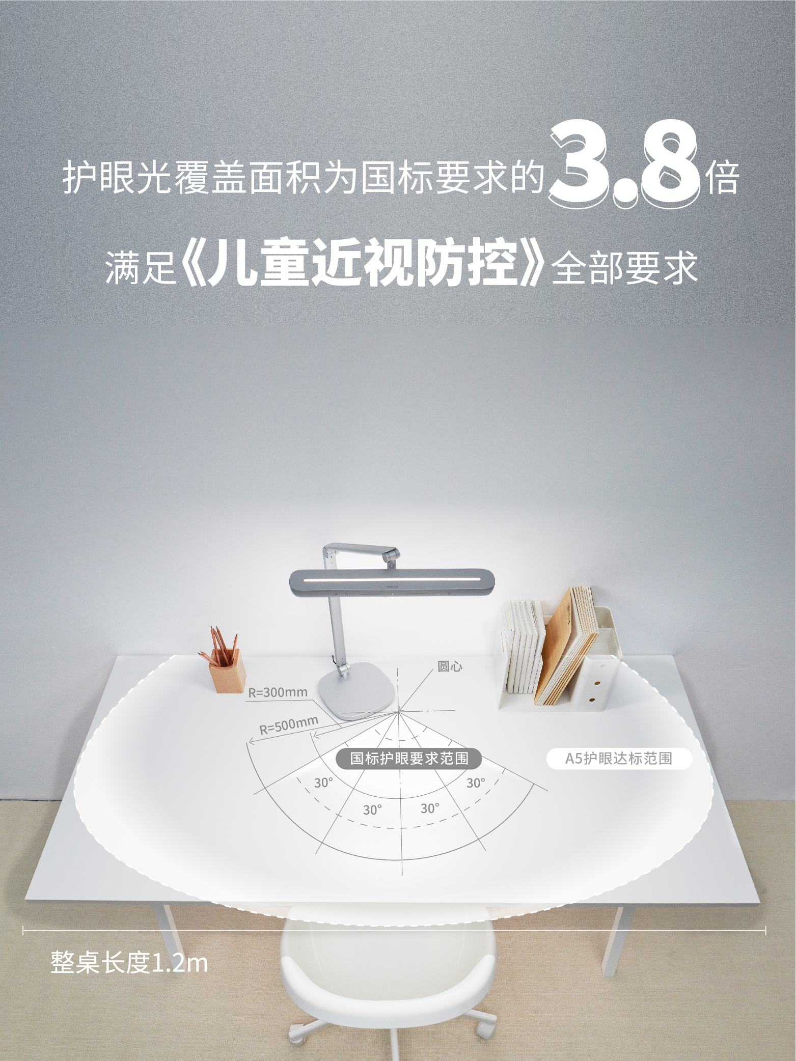 飞利浦A5智能护眼台灯拥有独特的超长T型灯头和隐藏式弧形发光面设计,提供超过国标测试范围的大面积光照,有效减少暗区阴影,让护眼柔光覆盖更大桌面范围。A5智能护眼台灯采用了辅助背光源设计,可将整个上层空间通透照亮,有效减少空间明暗对比,缓解孩子用眼疲劳。搭载的护眼“黑科技”瞳乐光技术,其独特的微棱镜阵列可保证光源无可视频闪、无蓝光危害,有效抑制眩光;实测显色指数高达96.5,高度还原物体真实色彩,让孩子在学习时享受自然而舒适的光效。