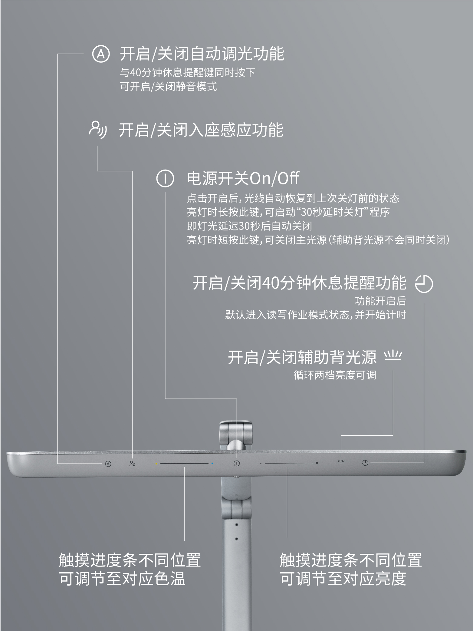 • 智能光感调节:搭载的光敏传感器实时监测用光环境光线变化,并自动匹配最适合的光源亮度,让桌面照度始终稳定在最适合的亮度阈值,不必再为灯光太亮或太暗而发愁;