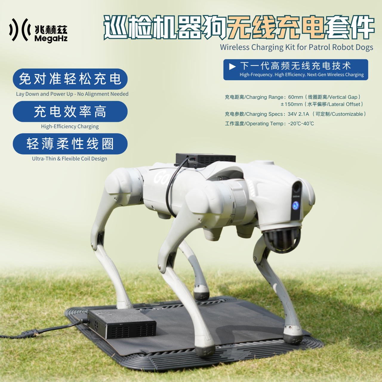 巡检机器狗无线充电套件:以“远距离充电”为核心,无需精准停靠即可稳定高效补能;IP67防护等级耐尘防水,轻松应对户外/工业场景。