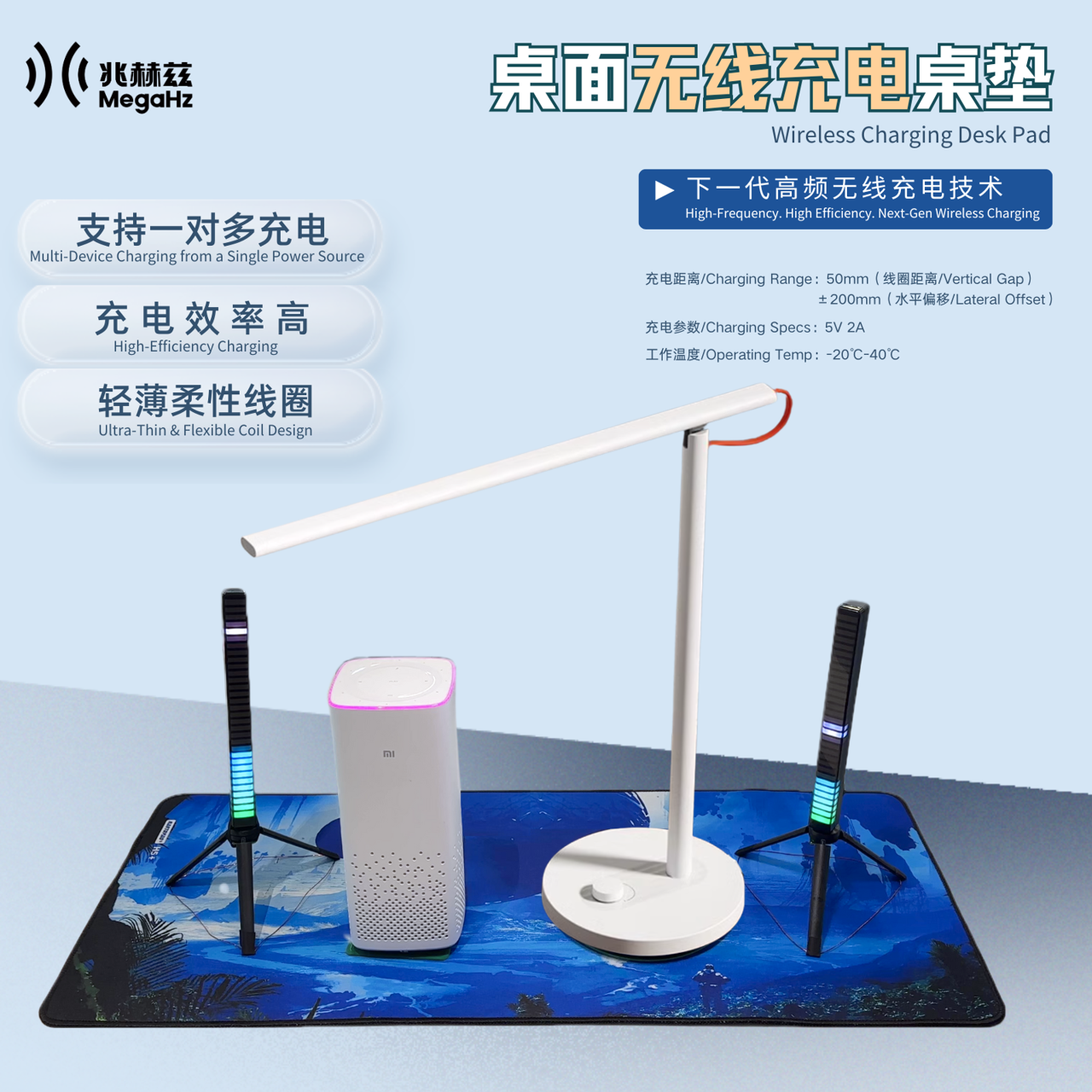 桌面无线充电桌垫:支持一对多设备同时充电,手机、耳机、手表、音箱随手一丢就能充,无需精准对齐,告别充电焦虑。