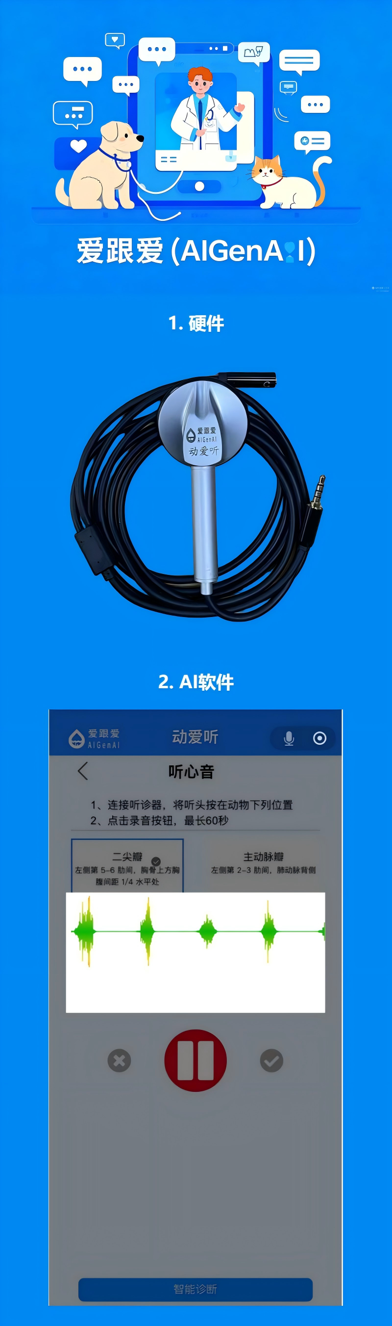 专为宠物健康监测设计的专业听诊设备,能够清晰捕捉宠物心音等信号,并辅助快速、准确地判断动物健康状况,广泛适用于宠物医院、宠物店、居家监测等场景。