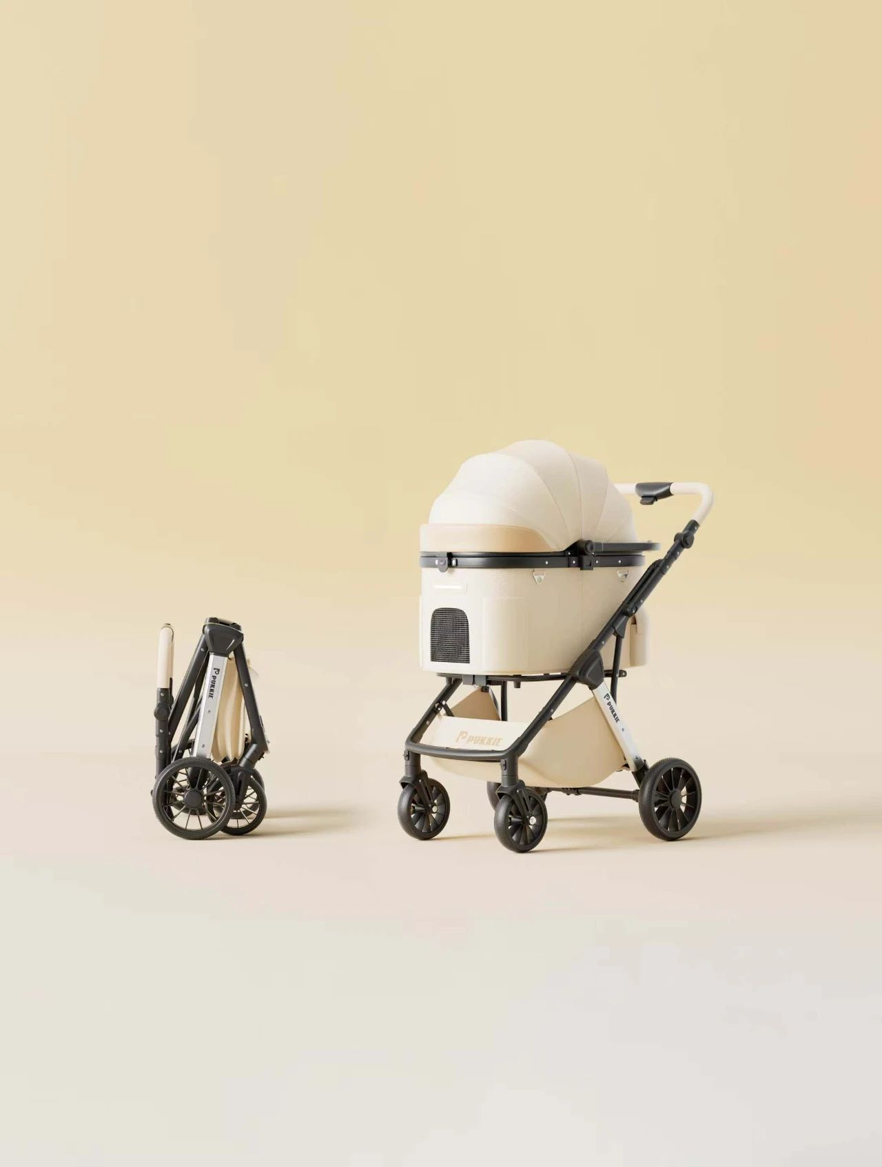 车身分离设计,折叠后可独立站立;可调顶棚;后轮刹车保护、内置安全锁扣。