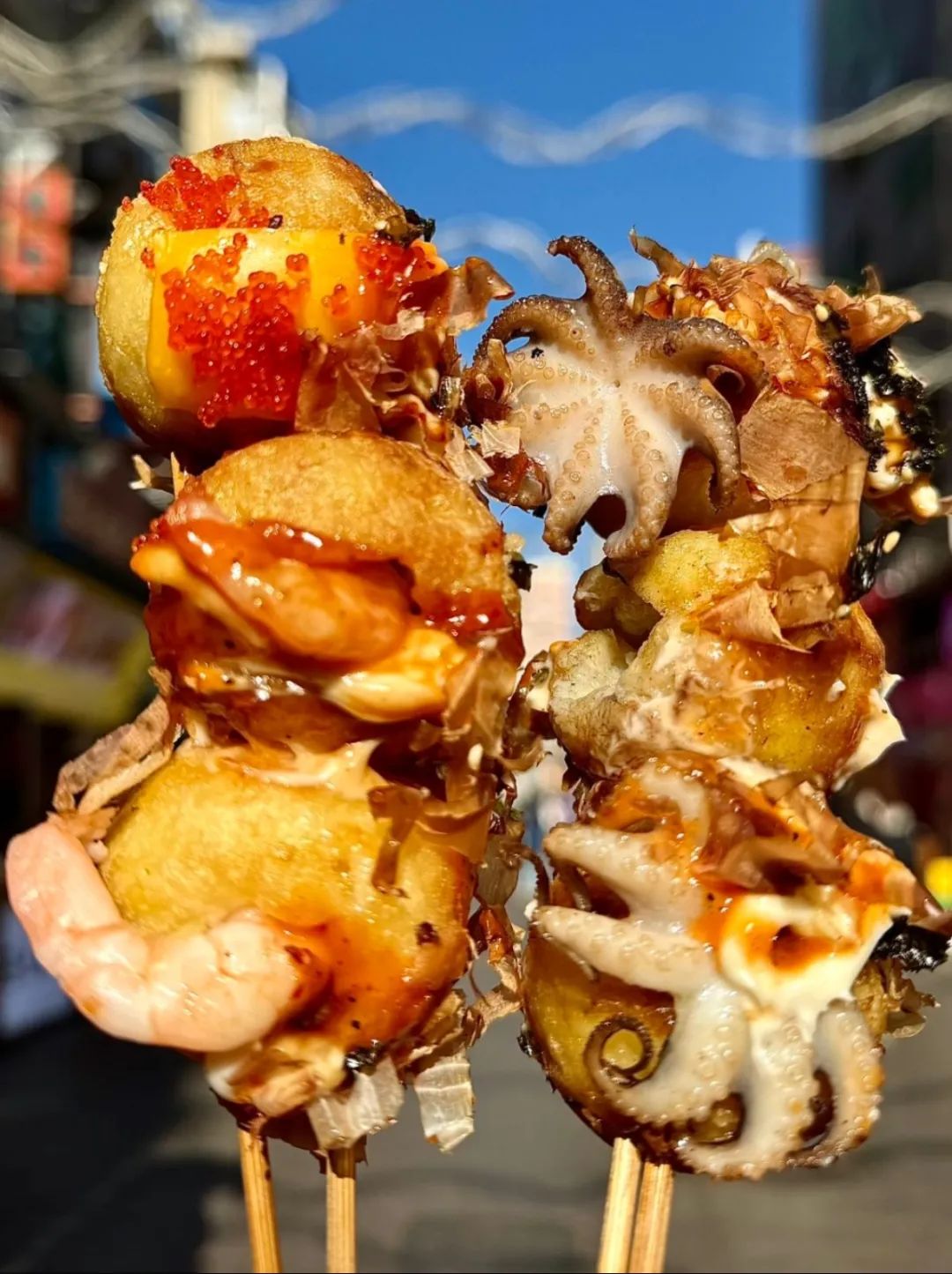 面糊裹着大块章鱼肉在铁盘翻滚,木鱼花随热浪妖娆起舞!戳破酥壳的瞬间,芝士岩浆裹着Q弹章鱼喷涌,海苔碎在舌尖噼啪炸响——建议闭眼吃,幸福感会加倍!