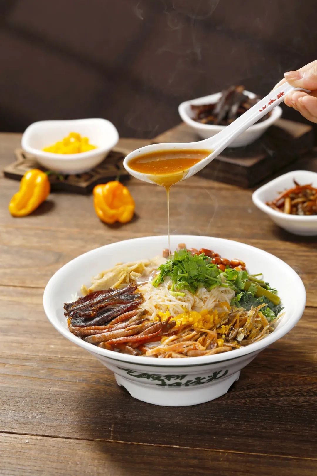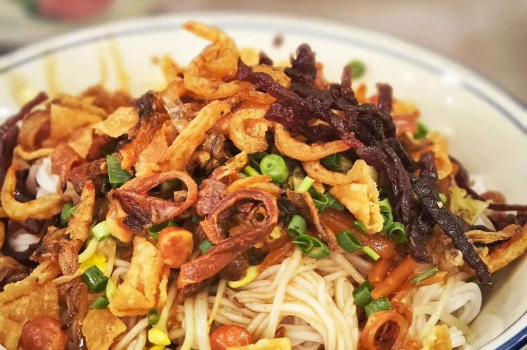 细米粉埋进酸笋炸弹阵,花生脆、肉干香、豆芽鲜在酸辣卤汁里缠斗!嗦粉时小心——酸笋的”生化攻击”正潜伏在柔滑米粉间,加入海南特色黄灯笼辣椒,一口入魂酸辣上头!