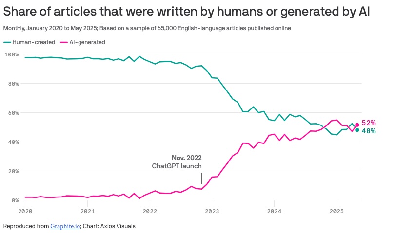 SEO 公司 Graphite 的报告分析了 2020 年 1 月至 2025 年 5 月间发布的 65000 篇英文文章。报告使用名为 Surfer 的 AI 检测工具,凡是内容中有不少于 50% 由大语言模型生成的文章,都被认定为 AI 文章。