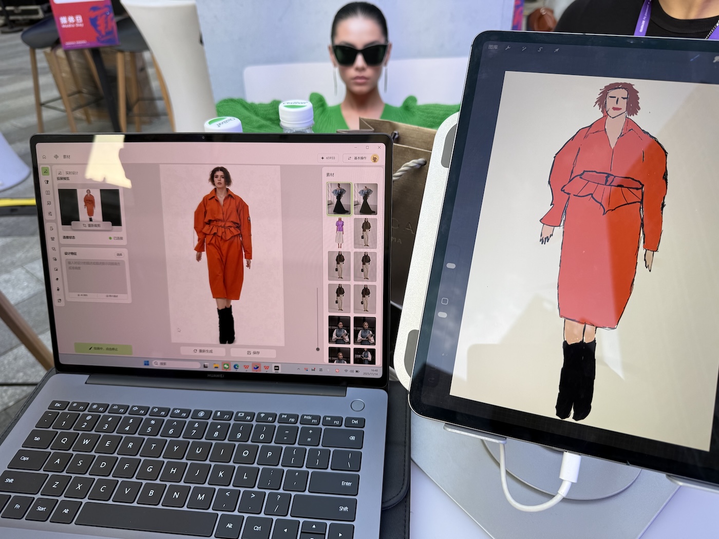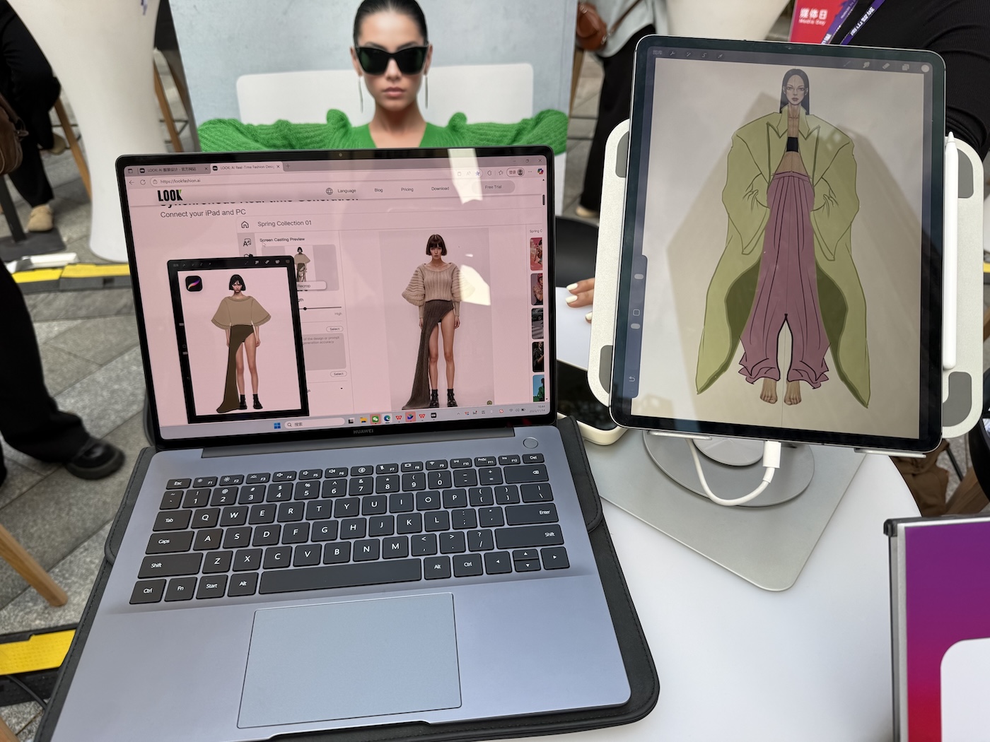 在首届 XIN 峰会的媒体日现场,我第一时间就被这家初创公司吸引了——原因简洁明了,当然是视觉上很抓眼球。LOOK 是一款专门为服装设计师打造的 AI 工具。其特点之一,是“实时设计”:设计师可在 iPad 上使用常见的绘图软件(如 Procreate)画出草图,同时通过电脑端(Windows 和 Mac)与 iPad 连接,AI 会即时将草图演化成完整的服装效果画面。换句话说,你在画一件衣服的轮廓或线条,屏幕就能马上显示出这件衣服的面料、褶皱、结构。