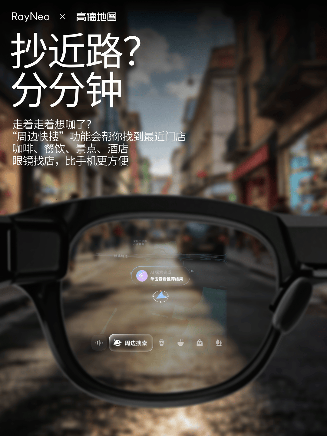 在功能层面,结合高德开放平台LBS Agent,雷鸟眼镜可以处理用户口语化的导航或搜索需求。系统会根据用户位置和使用习惯推荐行程规划,并在镜片上叠加显示周边环境的信息。同时,高德地图的“扫街榜”功能也接入了雷鸟X3 Pro,眼镜会在视野中直接显示周边商户的评分、客单价及特色标签等信息,辅助用户进行消费选择。对于寻找咖啡厅或便利店等即时需求,系统可通过定位在视野中直接标记附近门店。此外,雷鸟创新计划在未来与部分品牌合作推出“眼镜点单”功能,以整合从搜索、导航到交易的整体流程。