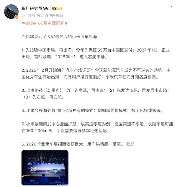 根据微博用户 @粮厂研究员Will 的说法,在今天的小米投资者日上,小米集团合伙人、总裁,手机部总裁卢伟冰谈到了小米汽车出海: