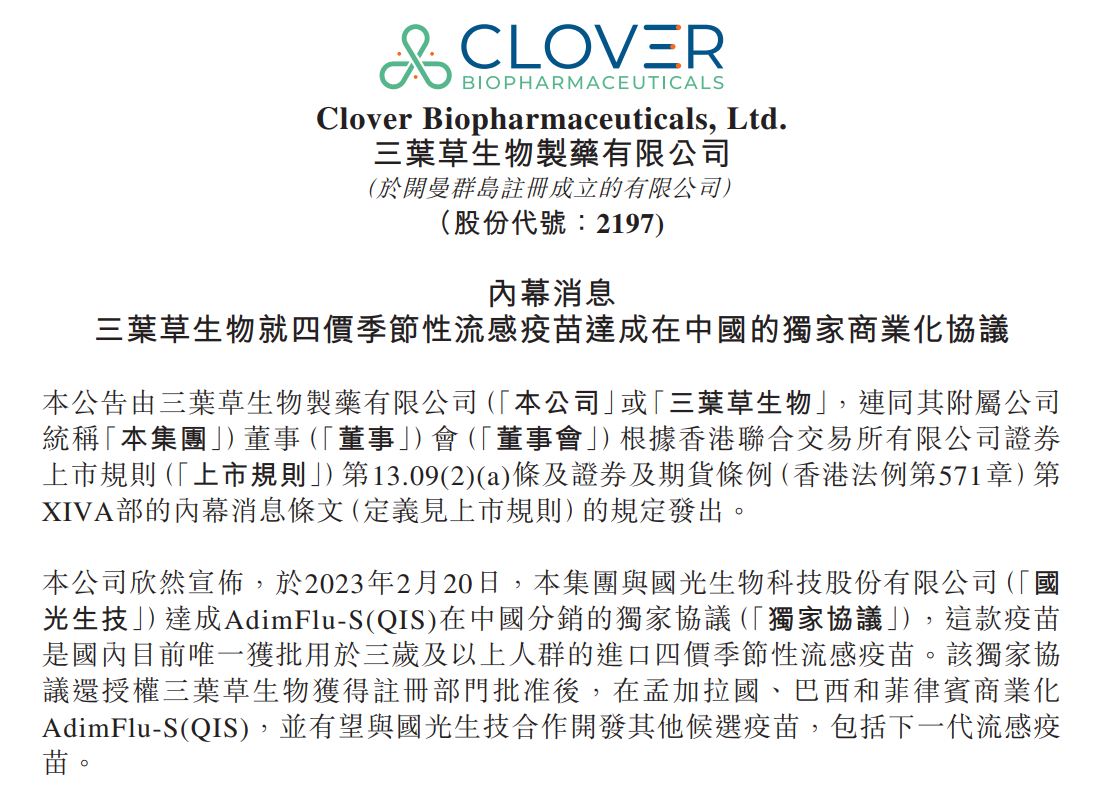 2月20日,三叶草生物(02197.HK)宣布,于2023年2月20日,集团与国光生物科技股份有限公司(「国光生技」)达成AdimFlu-S(QIS)在中国分销