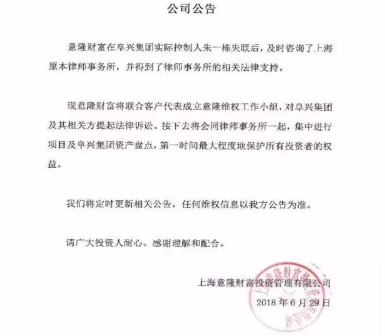 6月26日,意隆财富被公关机关查封,人去楼空。公司申明则称,其多个私募基金产品的相对方阜兴集团实控人朱一栋已经失联。