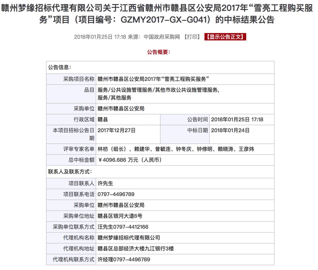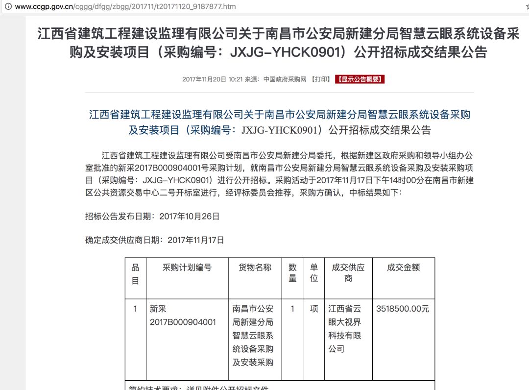 有据可查的是,江西南昌方案,中标的是一家名为“云眼大视界”的江西本土企业,2017年11月的中标金额为352万元。
