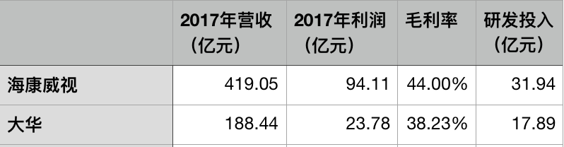 大华2017年总营收188.44亿元,同比增长41.38%,利润23.78亿元,同比增长30.33%,毛利率为38.23%。