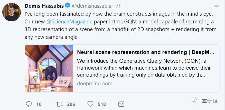 DeepMind的创始人兼CEO哈萨比斯表示,他一直都对大脑如何重现图像非常着迷,而这次提出的GQN模型可以根据几个2D快照重现3D场景表示,还能从任何角度渲染出来。