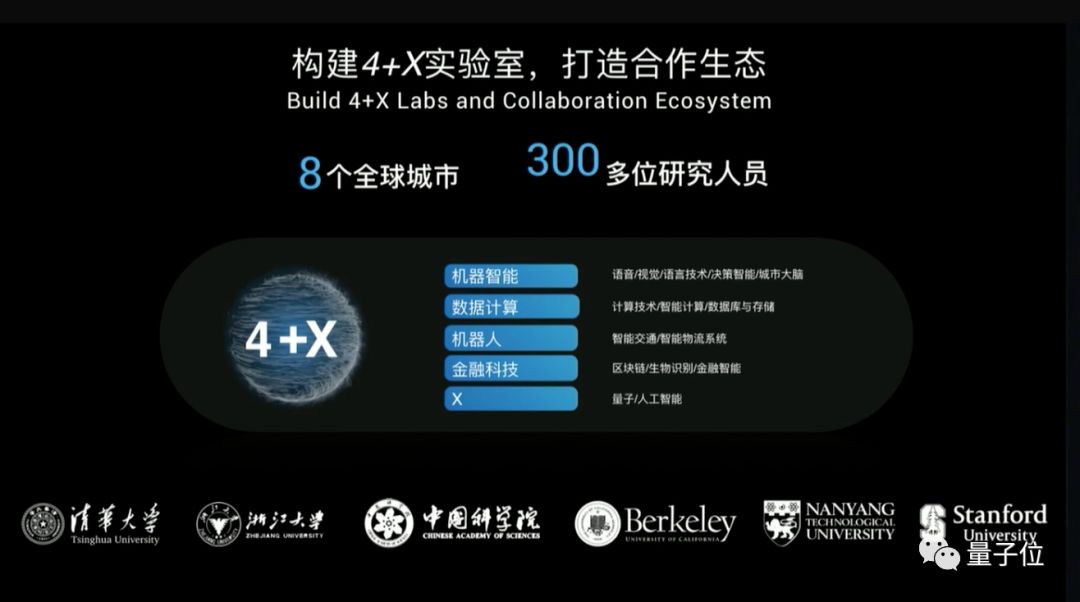 目前阿里达摩院已经构建了“4+X”实验室,也就是:机器智能、数据计算、机器人、金融科技和X,一共五个实验室,聚集了300多位研究人员,分支机构遍及全球8个城市。