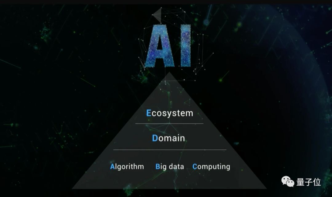 他也描绘了阿里的AI架构:ABCDE。A代表算法,B代表大数据,C代表计算,D代表领域,E代表生态系统。