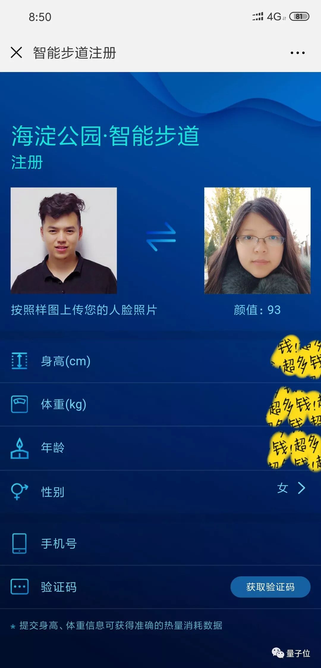 但是没想到,在注册页面上传头像照片后,系统竟然自动填写了注册者的身高、体重、性别、年龄。