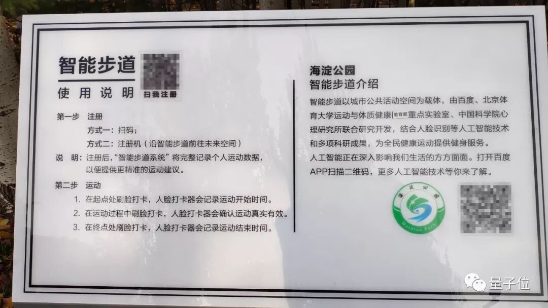量子位从公园东门一进来就看到了智能步道的牌子,扫码就能注册。