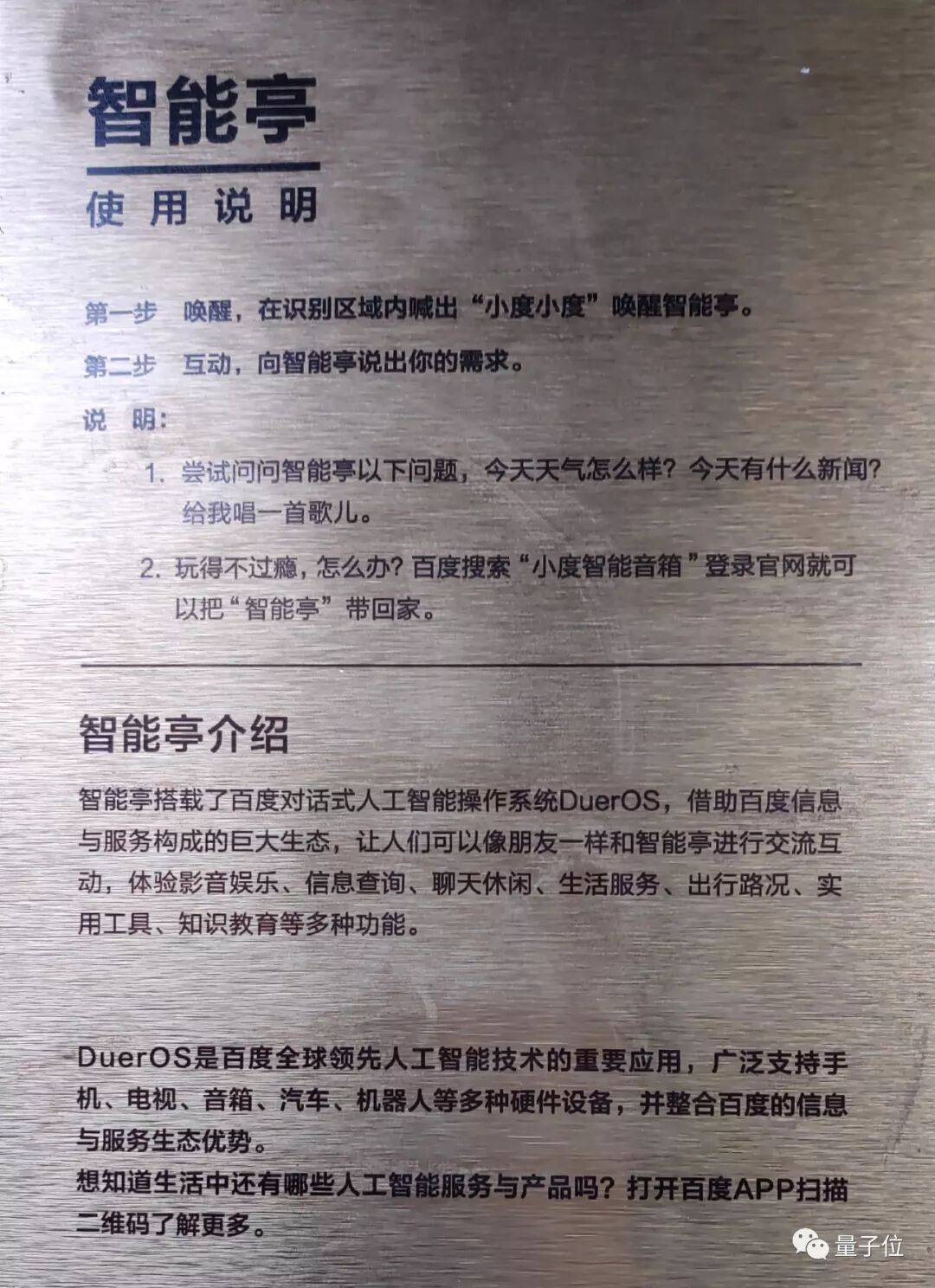 智能亭,其实就是“智能音箱”+“亭”。亭子正中央头顶上装着智能音箱,只要喊“小度小度”,它就和普通的智能音箱一样应答你。