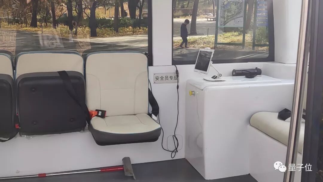 阿波龙上并没有方向盘、油门、刹车灯一系列设备。安全员座椅旁边设有一块屏幕,安全员通过这块屏幕来干预无人车行进的。正是这块屏幕让不少爷爷奶奶很有安全感:“这不上面有块pad,有人操作嘛。”