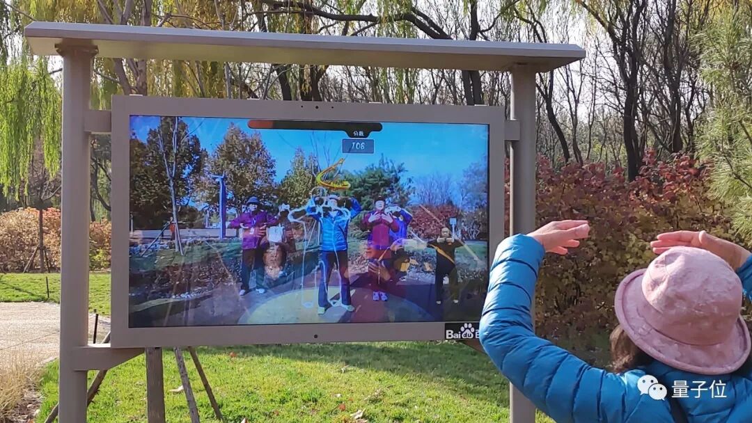 量子位提醒老人们,这个设备的正确玩法是站在中央让设备识别你的姿态,但老人们可能没有注意到右下角的AR教练,只觉得自己上前挡住线框图的话别人就看不见了。