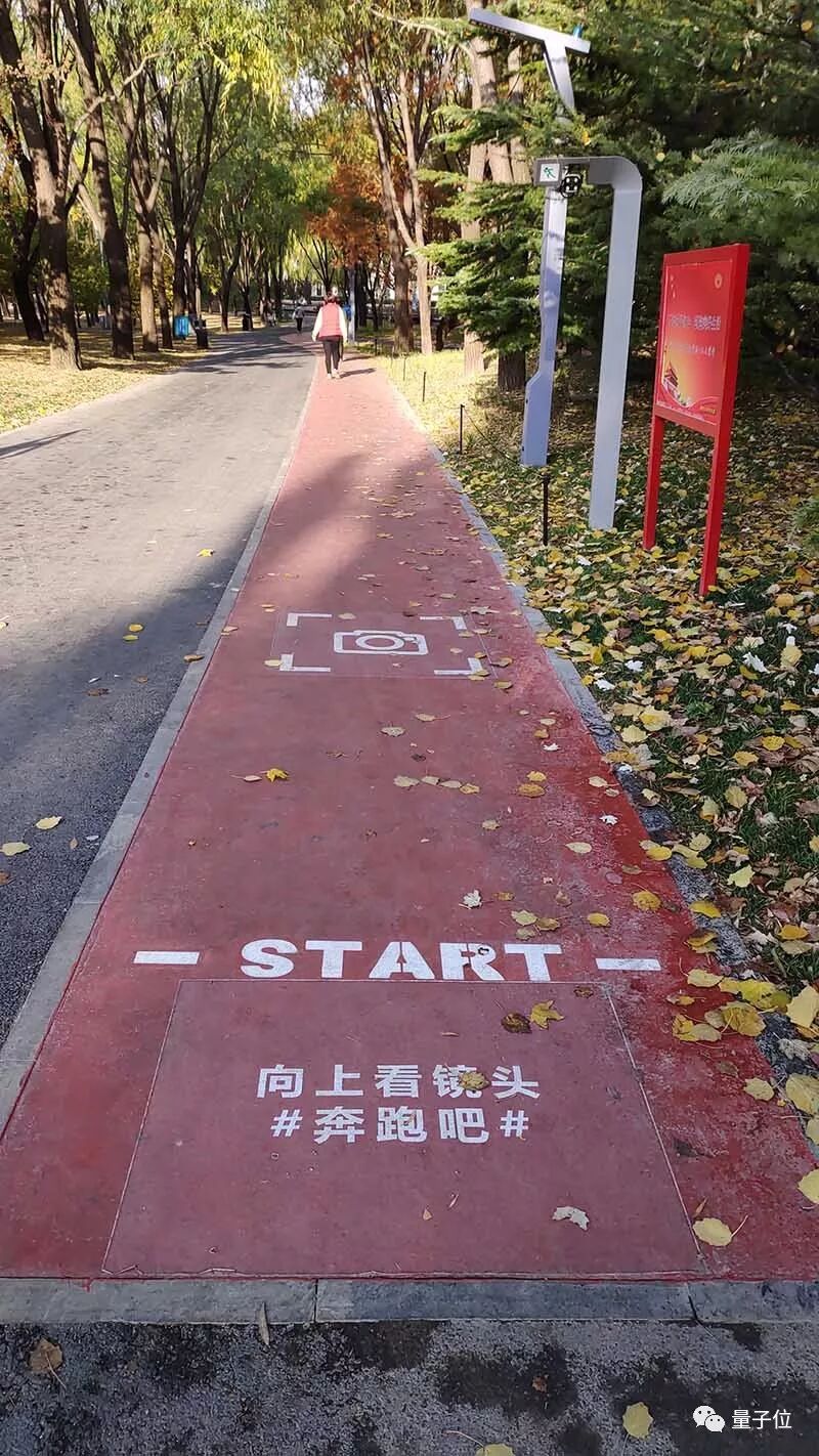 原来智能步道,就是公园红色跑道+人脸识别摄像机,经过起跑线,就会被摄像机记录下来。