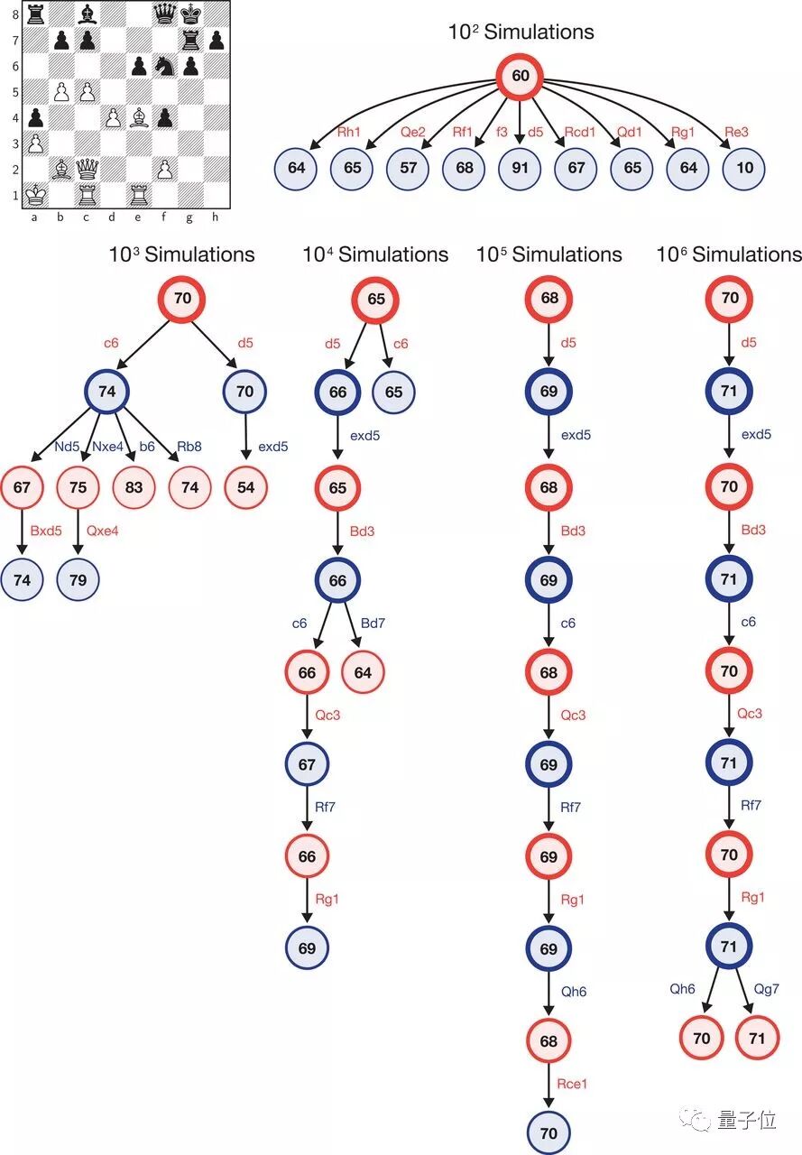 上图展示的是在AlphaZero执白、Stockfish执黑的一局国际象棋里,经过100次、1000次……直到100万次模拟之后,AlphaZero蒙特卡洛树的内部状态。每个树状图解都展示了10个最常访问的状态。