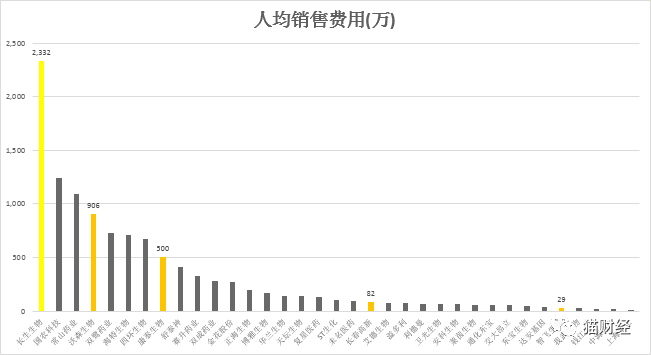 从人均销售费用看,长生生物25个销售人员,人均销售费用竟然高达2332万元,沃森生物和康泰生物两家企业人均销售费用也排名靠前,分别为906万元和500万元。