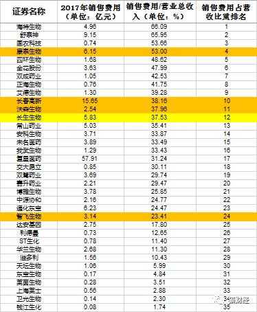在销售费用方面,35家生物制品上市公司的销售费用均值为4.52亿,销售费用占营收比重为28.93%。在5家主要人用疫苗生产企业中,有4家的销售费用占营收比重排名在前12名。长生生物5.83亿元的销售费用和37.53%的销售费用比例远高于行业均值。另外4家疫苗股有3家也超过行业平均值。