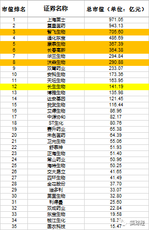 根据申万行业分类,在生物制品行业共有35家上市公司。从市值上来看,上海莱士以971.05亿元的市值排名第1,复星以943.13亿的市值紧随其后。主要生产人用疫苗的智飞生物排名第3,康泰生物第5,长春高新第6,沃森生物第8,本次疫苗案的“主人公”长生生物排在12位。
