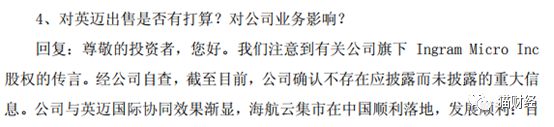 在资金链吃紧的情况下还如此大手笔收购不免让投资者产生疑问,期间还传出出售英迈的消息。在9月21日关于终止重大资产重组的投资者说明会上,投资人提出对英迈出售是否有打算时,海航科技并没有正面回答,而官方式的回答了截至目前公司确认不存在应披露而未披露的重大信息。