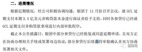 公告显示,银团于11月份召开会议,就GCL延期支付本期3.5亿美元并购贷款本金进行商议并给予支持,同时各参贷行已经就GCL延期支付并购贷款事项进行内部审批程序。