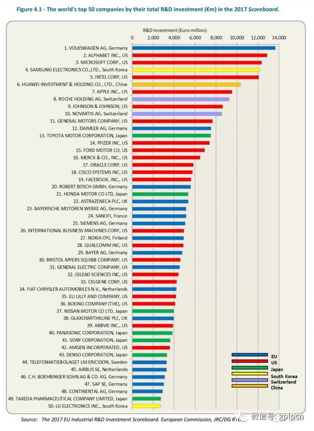 汽车产业是一个国家制造业的标杆,科技含量高。2017全球企业研发投入50强出炉,共有12家汽车行业企业入榜,这其中,德国大众汽车公司以136.72亿欧元连续第二年坐稳研发投入第一的宝座,紧随其后的是通用、戴姆勒和丰田,在研发上的投入分别为76.84亿欧元、75.36亿欧元。