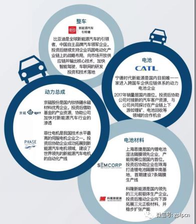 以国投创新旗下的先进制造产业投资基金为例,因为看好全球新能源汽车产业革命的战略机遇期,在一年半时间内,对汽车电动化细分领域的龙头企业投资布局,总投资金额47.2亿元,主要投资项目包括新能源汽车企业比亚迪、动力电池企业宁德时代、湿法隔膜企业上海恩捷、钕铁硼永磁制造企业京磁、正极材料企业河南科隆、伺服电机企业菲仕电机。