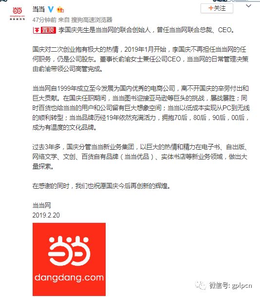 新闻的另一方,当当网发出公告,称李国庆从今年1月起不再担任当当网的任何职务,仍是公司股东,董事长俞渝女士兼任公司CEO,当当网的日常管理决策由俞渝带领公司高管完成。