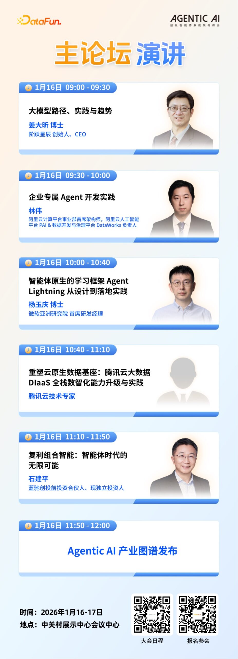 论坛内容将系统性地穿越智能体技术的全生命周期。我们将从Agentic Foundation Model的演进出发,探讨其自主进化与泛化能力的源泉;深入开发工具链与数据工程的底层支撑,解决高效构建与持续喂养的实践难题;并聚焦记忆工程与可信治理,确保智能体的可靠与合规。最后,会议将落脚于AgenticOS内核与行业实战,在DataAgent、专业助手、自主决策等丰富场景中,展示如何将技术转化为实际生产力与商业价值。
