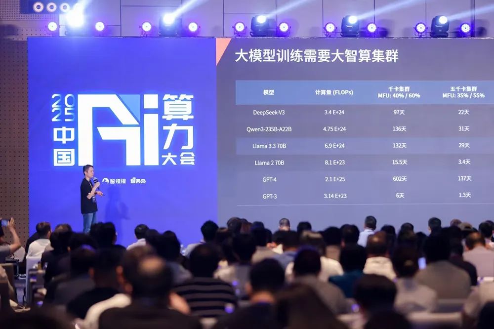 摩尔线程副总裁王华引用了一些研究数据:2020至2025年间,大模型训练的算力需求提升近1000倍 ,驱动力来自参数规模与数据量双向增长。以DeepSeek-V3为例,其训练所需算力达10²⁴级别,在万卡集群上可将训练时间压缩至13天内完成 。