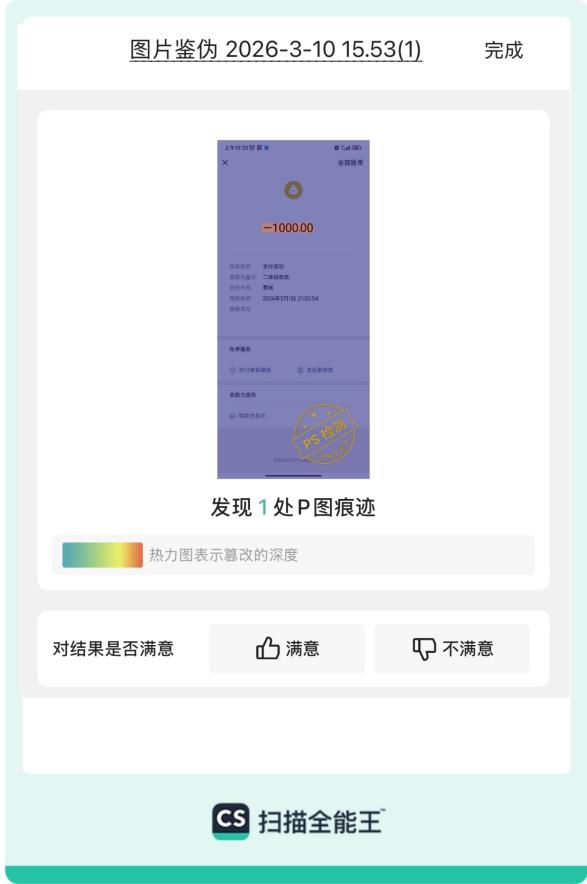 扫描全能王“图片鉴伪”功能识别并标出支付页面截图PS篡改痕迹