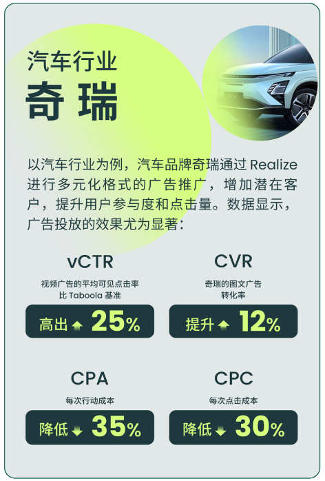 以汽车行业为例,汽车品牌奇瑞通过 Realize 进行多元化格式的广告推广,增加潜在客户,提升用户参与度和点击量。数据显示,广告投放的效果尤为显著:视频广告的平均可见点击率比 Taboola 基准高出25%,奇瑞的图文广告转化率提升 12%,每次行动成本(CPA)降低 35%,每次点击成本(CPC)降低 30%。